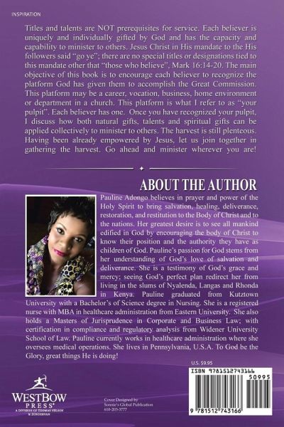 Titles and talents are NOT prerequisites for service. Each believer is uniquely and individually gifted by God and has the capacity and capability to minister to others. Jesus Christ in His mandate to the His followers said "go ye"; there are no special titles or designations tied to this mandate other that "those who believe", Mark 16:14-20. The main objective of this book is to encourage each believer to recognize the platform God has given them to accomplish the Great Commission. This platform may be a career, vocation, business, home environment or department in a church. This platform is what I refer to as "your pulpit". Each believer has one. Once you have recognized your pulpit, I discuss how both natural gifts, talents and spiritual gifts can be applied collectively to minister to others. The harvest is still plenteous. Having been already empowered by Jesus, let us join together in gathering the harvest. Go ahead and minister wherever you are!