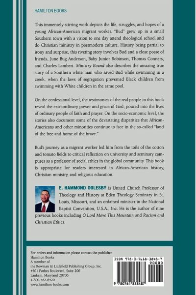 This immensely stirring work depicts the life, struggles, and hopes of a young African- American migrant worker. "Bud" grew up in a small Southern town with a vision to one day attend theological school and do Christian ministry in postmodern culture. History being partial to irony and surprise, this riveting story involves Bud and a close posse of friends, June Bug Anderson, Baby Junior Robinson, Thomas Conners, and Charles Lambert. Ministry Bound also describes the amazing true story of a Southern white man who saved Bud while swimming in a creek, when the laws of segregation prevented Black children from swimming with White children in the same pool. On the confessional level, the testimonies of the real people in this book reveal the extraordinary power and grace of God, poured into the lives of ordinary people of faith and prayer. On the socio-economic level, the stories also document some of the devastating disparities that African Americans and other minorities continue to face in the so-called "land of the free and home of the brave." Bud's journey as a migrant worker led him from the toils of the cotton and tomato fields to critical reflection on university and seminary campuses as a professor of social ethics in the global community. This book is appropriate for readers interested in African-American history, Christian ministry, and religious education.
