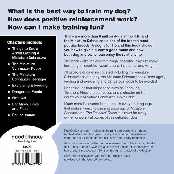 There are more than 8 million dogs in the U.K. and the Miniature Schnauzer is one of the top ten most popular breeds. A dog is for life and this book shows you how to give a puppy a good home and how both dog and owner can enjoy the relationship. The book walks the owner through ‘essential things to know’ including: microchips; vaccinations; insurance; weight etc. All aspects of care are covered including: the Miniature Schnauzer as a puppy; the Miniature Schnauzer as a ‘teen-ager’; feeding and exercising and dangerous foods to be avoided. Health issues that might arise such as Ear mites, Ticks and Fleas are addressed and a chapter on first aid for your Miniature Schnauzer is invaluable. Much more is covered in the book in everyday language that makes it easy to use and understand. Miniature Schnauzers – The Essential Guide is a must for every owner, or potential owner, of this delightful dog.