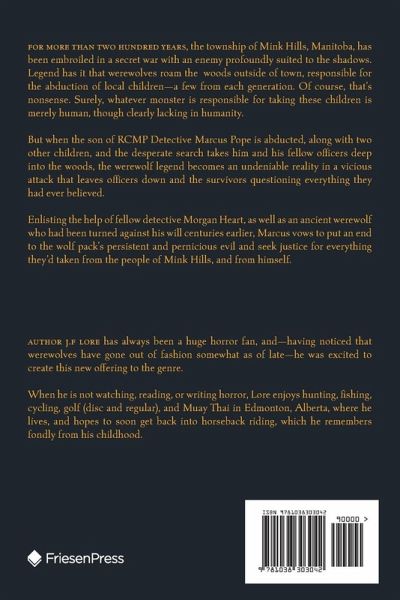 For more than two hundred years, the township of Mink Hills, Manitoba, has been embroiled in a secret war with an enemy profoundly suited to the shadows. Legend has it that werewolves roam the woods outside of town, responsible for the abduction of local children-a few from each generation. Of course, that's nonsense. Surely, whatever monster is responsible for taking these children is merely human, though clearly lacking in humanity. But when the son of RCMP Detective Marcus Pope is abducted, along with two other children, and the desperate search takes him and his fellow officers deep into the woods, the werewolf legend becomes an undeniable reality in a vicious attack that leaves officers down and the survivors questioning everything they had ever believed. Enlisting the help of fellow detective Morgan Heart, as well as an ancient werewolf who had been turned against his will centuries earlier, Marcus vows to put an end to the wolf pack's persistent and pernicious evil and seek justice for everything they'd taken from the people of Mink Hills, and from himself.