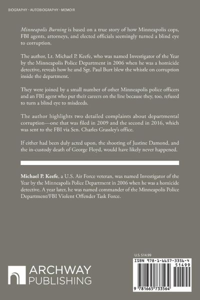 Minneapolis Burning is based on a true story of how Minneapolis cops, FBI agents, attorneys, and elected officials seemingly turned a blind eye to corruption. The author, Lt. Michael P. Keefe, who was named Investigator of the Year by the Minneapolis Police Department in 2006 when he was a homicide detective, reveals how he and Sgt. Paul Burt blew the whistle on corruption inside the department. They were joined by a small number of other Minneapolis police officers and an FBI agent who put their careers on the line because they, too, refused to turn a blind eye to misdeeds. The author highlights two detailed complaints about departmental corruption-one that was filed in 2009 and the second in 2016, which was sent to the FBI via Sen. Charles Grassley's office. If either had been duly acted upon, the officer involved shooting of Justine Damond, and the in-custody death of George Floyd, would have likely never happened.