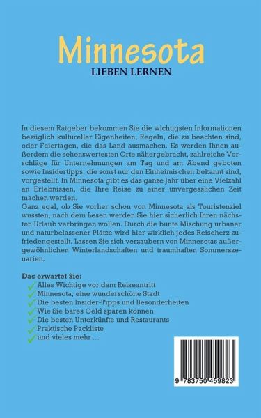 In diesem Ratgeber bekommen Sie die wichtigsten Informationen bezüglich kultureller Eigenheiten, Regeln, die zu beachten sind, oder Feiertagen, die das Land ausmachen. Es werden Ihnen außerdem die sehenswertesten Orte nähergebracht, zahlreiche Vorschläge für Unternehmungen am Tag und am Abend geboten sowie Insidertipps, die sonst nur den Einheimischen bekannt sind, vorgestellt. In Minnesota gibt es das ganze Jahr über eine Vielzahl an Erlebnissen, die Ihre Reise zu einer unvergesslichen Zeit machen werden.Ganz egal, ob Sie vorher schon von Minnesota als Touristenziel wussten, nach dem Lesen werden Sie hier sicherlich Ihren nächsten Urlaub verbringen wollen. Durch die bunte Mischung urbaner und naturbelassener Plätze wird hier wirklich jedes Reiseherz zufriedengestellt. Lassen Sie sich verzaubern von Minnesotas außergewöhnlichen Winterlandschaften und traumhaften Sommerszenarien.Das erwartet Sie:-Alles Wichtige vor dem Reiseantritt-Minnesota, eine wunderschöne Stadt-Die besten Insider-Tipps und Besonderheiten-Wie Sie bares Geld sparen können-Die besten Unterkünfte und Restaurants-Praktische Packliste-und vieles mehr ...