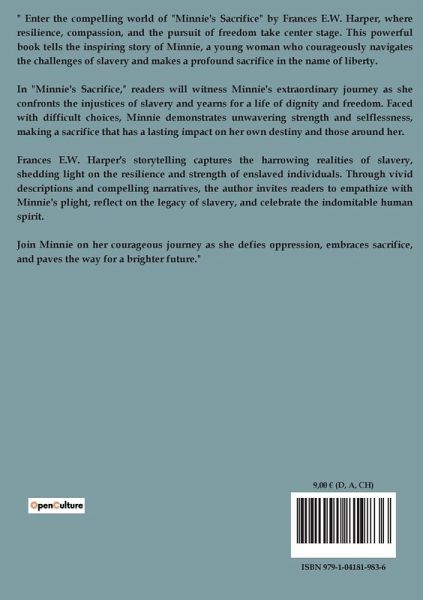 " Enter the compelling world of "Minnie's Sacrifice" by Frances E.W. Harper, where resilience, compassion, and the pursuit of freedom take center stage. This powerful book tells the inspiring story of Minnie, a young woman who courageously navigates the challenges of slavery and makes a profound sacrifice in the name of liberty. In "Minnie's Sacrifice," readers will witness Minnie's extraordinary journey as she confronts the injustices of slavery and yearns for a life of dignity and freedom. Faced with difficult choices, Minnie demonstrates unwavering strength and selflessness, making a sacrifice that has a lasting impact on her own destiny and those around her. Frances E.W. Harper's storytelling captures the harrowing realities of slavery, shedding light on the resilience and strength of enslaved individuals. Through vivid descriptions and compelling narratives, the author invites readers to empathize with Minnie's plight, reflect on the legacy of slavery, and celebrate the indomitable human spirit. Join Minnie on her courageous journey as she defies oppression, embraces sacrifice, and paves the way for a brighter future."