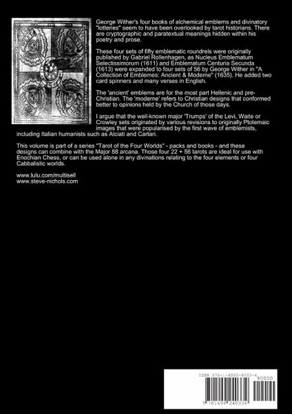 This book exposes coincidences between the fifty-six minor arcana of the Marseilles tarot (later Waite and Golden Dawn minor arcana) and this series of 56 times four Winds divination figures - called "lotteries" in 1635. Wither insisted in 56 rather than 50, I argue because then these lotteries could be chosen with just one spinner, plus playing cards. The designs appeared originally in Gabriel Rollenhagen's Nucleus Emblematum (1611) and Emblematum Centuria Secunda (1613). Wither added 4x6 figures to the 4x50 originals, adding cryptic poetry in English, plus his own method of Four Winds divination by two cardboard spinners (one shown back cover). Wither's also commissioned the alchemical frontispiece (front cover). These four sets of 56 can be combined with the 88 'Triumphs' (4x22 Major's) published as part of my "Taro of the Four Worlds" series.