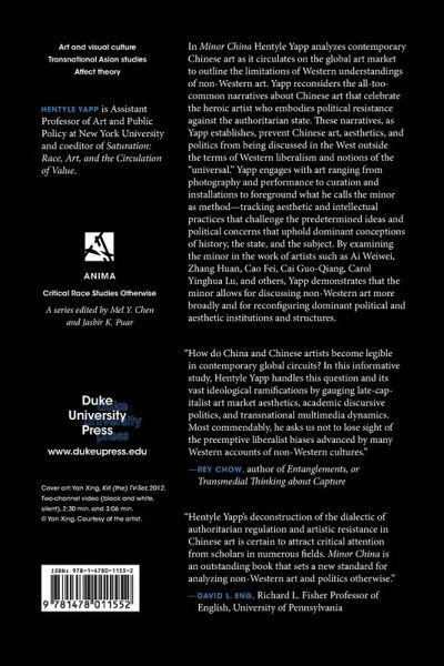 In Minor China Hentyle Yapp analyzes contemporary Chinese art as it circulates on the global art market to outline the limitations of Western understandings of non-Western art. Yapp reconsiders the all-too-common narratives about Chinese art that celebrate the heroic artist who embodies political resistance against the authoritarian state. These narratives, as Yapp establishes, prevent Chinese art, aesthetics, and politics from being discussed in the West outside the terms of Western liberalism and notions of the "universal." Yapp engages with art ranging from photography and performance to curation and installations to foreground what he calls the minor as method-tracking aesthetic and intellectual practices that challenge the predetermined ideas and political concerns that uphold dominant conceptions of history, the state, and the subject. By examining the minor in the work of artists such as Ai Weiwei, Zhang Huan, Cao Fei, Cai Guo-Qiang, Carol Yinghua Lu, and others, Yapp demonstrates that the minor allows for discussing non-Western art more broadly and for reconfiguring dominant political and aesthetic institutions and structures.