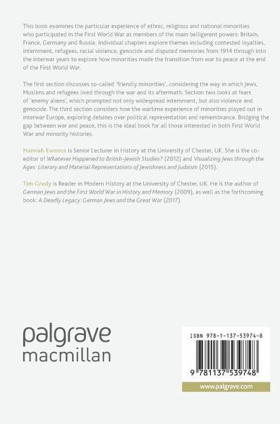 The first section discusses so-called 'friendly minorities', considering the way in which Jews, Muslims and refugees lived through the war and its aftermath. Section two looks at fears of 'enemy aliens', which prompted not only widespread internment, but also violence and genocide. The third section considers how the wartime experience of minorities played out in interwar Europe, exploring debates over political representation and remembrance. Bridging the gap between war and peace, this isthe ideal book for all those interested in both First World War and minority histories.