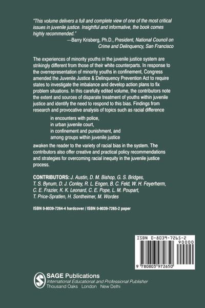 Providing current information on the disparate treatment of minority youth within the juvenile justice system, this volume begins by identifying the need for a better understanding of how minority youths experience this system. The book then draws on research programmes that reflect different techniques of investigation, sampling and analysis with several racial minority groups. Topics include: juvenile encounters with police; the role of community structure in shaping the perceptions of juvenile crime and the response to it; and the treatment of Native American youths in juvenile justice. In conclusion the book outlines strategies for research and observation of over-representation of minorities as well as steps to help overcome racial bias in juvenile justice processing.