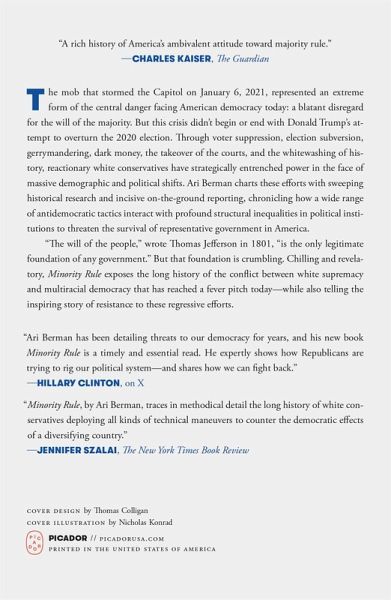 "Voting rights journalist Ari Berman has been detailing threats to our democracy for years, and his new book Minority Rule is a timely and essential read. He expertly shows how Republicans are trying to rig our political system-and shares how we can fight back." -Hillary Clinton on X A riveting account of the decades-long effort by reactionary white conservatives to undermine democracy and entrench their power-and the movement to stop them. The mob that stormed the Capitol on January 6, 2021, represented an extreme form of the central danger facing American democracy today: a blatant disregard for the will of the majority. But this crisis didn't begin or end with Donald Trump's attempt to overturn the 2020 election. Through voter suppression, election subversion, gerrymandering, dark money, the takeover of the courts, and the whitewashing of history, reactionary white conservatives have strategically entrenched power in the face of a massive demographic and political shift. Ari Berman charts these efforts with sweeping historical research and incisive on-the-ground reporting, chronicling how a wide range of antidemocratic tactics interact with profound structural inequalities in institutions like the Electoral College, the Senate, and the Supreme Court to threaten the survival of representative government in America. "The will of the people," wrote Thomas Jefferson in 1801, "is the only legitimate foundation of any government." But that foundation is crumbling. Some counter-majoritarian measures were deliberately built into the Constitution, which was designed in part to benefit a small propertied upper class, but they have metastasized to a degree that the Founding Fathers could never have anticipated, undermining the very notion of "a government of the people, by the people, and for the people." Chilling and revelatory, Minority Rule exposes the long history of the conflict between white supremacy and multiracial democracy that has reached a fever pitch today-while also telling the inspiring story of resistance to these regressive efforts.