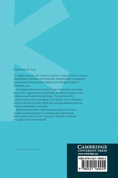 The state of English company law on minority shareholders' remedies is analysed in the light of the UK Law Commission, further appraised by the Company Law Review Steering Group. As well as considering the complexities of derivative actions and statutory minority remedies, this book discusses future directions for minority shareholders' remedies.