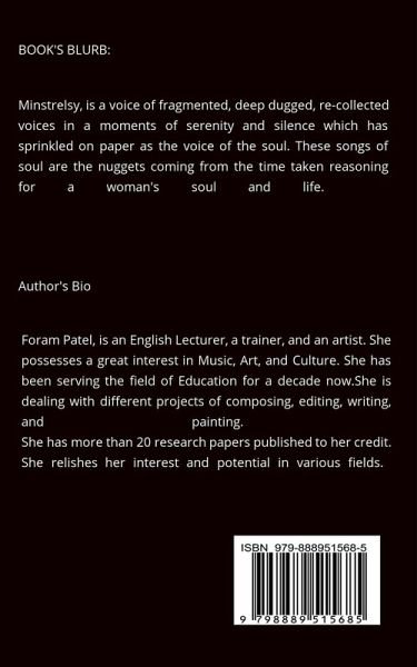 "Minstrelsy" is a book, a collection of poems on one of the fascinating interest areas of human life and emotions, from the mind and heart of a woman who has been into art, culture, and training for many years. It comprises some 35 free verse poems beautifully penned in the simplest form to reach out to all readers so as to make them understand and enjoy the beauty of the poetry-reading with ease and comfort. The reading of the poems is flawless and effortless. It is worth reading.