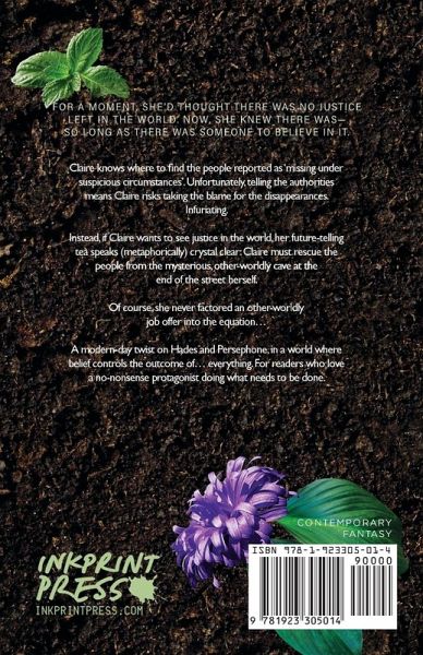 Claire knows where to find the people reported as 'missing under suspicious circumstances'. Unfortunately, telling the authorities means Claire risks taking the blame for the disappearances. Infuriating. Instead, if Claire wants to see justice in the world, her future-telling tea speaks (metaphorically) crystal clear: Claire must rescue the people from the mysterious, other-worldly cave at the end of the street herself. Of course, she never factored an other-worldly job offer into the equation... A modern-day twist on Hades and Persephone, in a world where belief controls the outcome of... everything. For readers who love a no-nonsense protagonist doing what needs to be done.