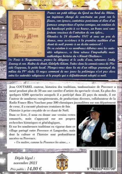 Jean Coutarel, conteur, conférencier, historien des traditions, tambourinaire de Provence a mené pendant plus de 50 ans une carrière d'artiste du spectacle vivant. En plus des quelques 6500 spectacles produits dans 25 pays du monde, il est l'auteur de nombreux enregistrements, de productions diverses. Collaborateur de la Radio France Bleu Vaucluse pour plus de 500 chroniques journalières, il a raconté des centaines de fois l'histoire à peine croyable de ce chant de Noël. Dans ce livre, il nous propose une version certes romancée, mais qui s'appuie sur ses propres recherches historiques et généalogiques. Et sur les traditions en vigueur dans ce village partagé entre la Provence et le Languedoc, mais dont la langue, la culture et l'histoire sont profondément ancrées en Provence. "Un Maître, comme la Provence les aime".