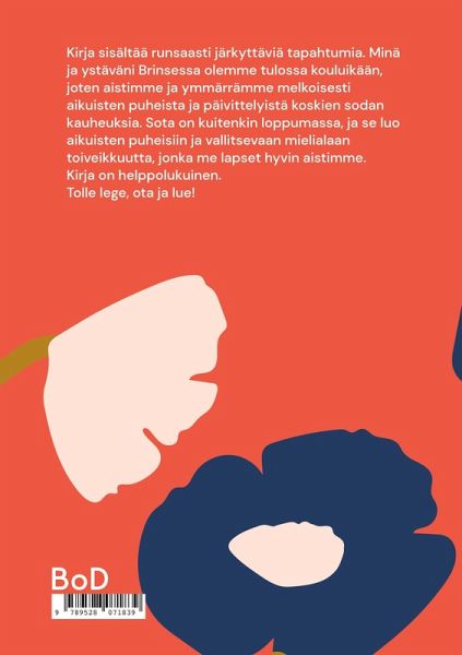 Kirja sisältää runsaasti järkyttäviä tapahtumia. Minä ja ystäväni Brinsessa olemme tulossa kouluikään, joten aistimme ja ymmärrämme melkoisesti aikuisten puheista ja päivittelyistä koskien sodan kauheuksia. Sota on kuitenkin loppumassa, ja se luo aikuisten puheisiin ja vallitsevaan mielialaan toiveikkuutta, jonka me lapset hyvin aistimme. Kirja on helppolukuinen. Tolle lege, ota ja lue!