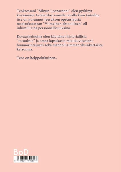Teoksessani "Minun Leonardoni" olen pyrkinyt kuvaamaan Leonardoa samalla tavalla kuin taiteilija itse on kuvannut Jeesuksen opetuslapsia maalauksessaan "Viimeinen ehtoollinen" eli inhimillisinä persoonallisuuksina. Kuvauskeinoina olen käyttänyt historiallisia "totuuksia" ja omaa lapsekasta mielikuvitustani, huumorintajuani sekä mahdollisimman yksinkertaista kerrontaa. Teos on helppolukuinen..