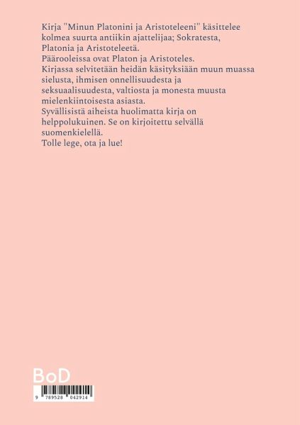 Kirja "Minun Platonini ja Aristoteleeni" käsittelee kolmea suurta antiikin ajattelijaa; Sokratesta, Platonia ja Aristoteleetä. Päärooleissa ovat Platon ja Aristoteles. Kirjassa selvitetään heidän käsityksiään muun muassa sielusta, ihmisen onnellisuudesta ja seksuaalisuudesta, valtiosta ja monesta muusta mielenkiintoisesta asiasta. Syvällisistä aiheista huolimatta kirja on helppolukuinen. Se on kirjoitettu selvällä suomenkielellä. Tolle lege, ota ja lue!