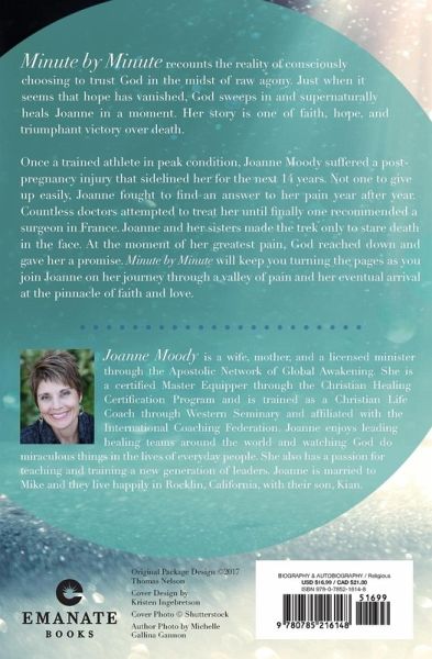 Looking at a decade's worth of chronic pain, a promise from God helped Joanne stand firm until He ultimately heals her. Minute by Minute recounts the reality of consciously choosing to trust God in the midst of raw agony. Just when it seems that hope has vanished, God sweeps in and supernaturally heals Joanne in a moment. Her story is one of faith, hope, and triumphant victory over death. Once a trained athlete in peak condition, Joanne Moody suffered a post-pregnancy injury that sidelined her for the next 14 years. Not one to give up easily, Joanne fought to find an answer to her pain year after year. Countless doctors attempted to treat her until finally one recommended a surgeon in France. Joanne and her sisters make the trek only to stare death in the face. At the moment of her greatest pain, God reached down and gave her a promise. Minute by Minute will keep you turning the pages as you join Joanne on her journey through a valley of pain and her eventual arrival at the pinnacle of faith and love.