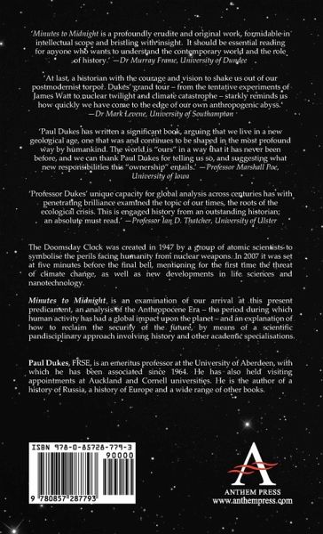 The book examines the evolution of the predicament symbolised by the setting of the Doomsday Clock at a few minutes to midnight in the context of the Anthropocene Era from 1763, making special reference to the study of history.