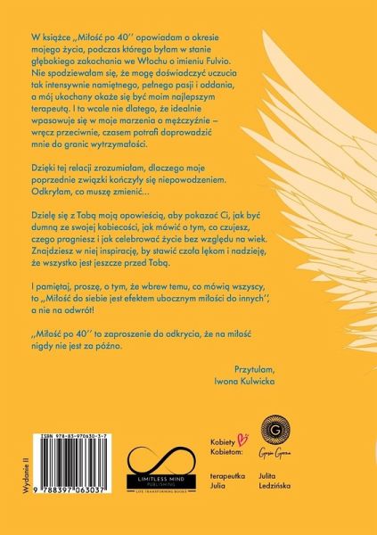 Odkryj transformacyjn¿ podró¿ ku mi¿öci do siebie i budowaniu relacji partnerskich w ,,Mi¿ö¿ po 40: Jak zakochä si¿ na Tinderze. Ksi¿¿ka dla kobiet, które nie wierz¿ w mi¿ö¿''. W ksi¿¿ce ,,Mi¿ö¿ po 40'' opowiadam o g¿¿bokim zakochaniu we W¿ochu o imieniu Fulvio. Nie spodziewäam si¿, ¿e mog¿ döwiadczy¿ uczucia tak intensywnie nami¿tnego, pe¿nego pasji i oddania, a mój ukochany okäe si¿ by¿ moim najlepszym terapeut¿. I to wcale nie dlatego, ¿e idealnie wpasowuje si¿ w moje marzenia o m¿¿czy¿nie - wr¿cz przeciwnie, czasem potrafi doprowadzi¿ mnie do granic wytrzymäöci. Dzi¿ki tej relacji zrozumiäam, dlaczego moje poprzednie zwi¿zki köczy¿y si¿ niepowodzeniem. Odkry¿am, co musz¿ zmieni¿... Dziel¿ si¿ z Tob¿ moj¿ opowie¿ci¿, aby pokazä Ci, jak by¿ dumn¿ ze swojej kobiecöci, jak mówi¿ o tym, co czujesz, czego pragniesz i jak celebrowä ¿ycie bez wzgl¿du na wiek. Znajdziesz w niej inspiracj¿, by stawi¿ czöa l¿kom i nadziej¿, ¿e wszystko jest jeszcze przed Tob¿. I pami¿taj, prosz¿, o tym, ¿e wbrew temu, co mówi¿ wszyscy, to ,,Mi¿ö¿ do siebie jest efektem ubocznym mi¿öci do innych'', a nie na odwrót! ,,Mi¿ö¿ po 40'' to zaproszenie do odkrycia, ¿e na mi¿ö¿ nigdy nie jest za pó¿no. Przytulam, Iwona Kulwicka ,,Mi¿ö¿ po 40'' to nie tylko ksi¿¿ka; to zaproszenie do wyruszenia w fascynuj¿c¿ podró¿ samoodkrycia, mi¿öci i odnowionej nadziei. ,,Mi¿ö¿ po 40'' to: Umocnienie: Naucz si¿ ceni¿ swoj¿ kobiecö¿ i si¿¿, jak¿ niesie. Samoekspresja: Zyskaj pewnö¿ siebie, by wyrää swoje pragnienia i uczucia bez l¿ku. Zrozumienie mi¿öci: Odkryj prawdziw¿ esencj¿ mi¿öci, wykraczaj¿c¿ poza spöeczne oczekiwania i stereotypy. Pokonywanie strachu: Znajd¿ inspiracj¿, aby stawi¿ czöo i przezwyci¿¿y¿ swoje obawy, otwieraj¿c drzwi do nowych möliwöci. Odnowiona nadzieja: Odnów swoj¿ wiar¿ w mi¿ö¿, üwiadamiaj¿c sobie, ¿e nigdy nie jest za pó¿no, by döwiadczy¿ jej magii. Przyjmij zaproszenie do podró¿y pe¿nej mi¿öci i samoodkrycia z ,,Mi¿ö¿ po 40''. Twoja historia mi¿öci nie jest zaköczona; ona stale ewoluuje.