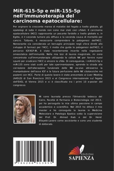 Per arginare la crescente marea di malattie del fegato a livello globale, gli epatologi di tutto il mondo non sono mai stati così sfidati. Il carcinoma epatocellulare (HCC) rappresenta un pesante fardello a livello globale e, in Egitto, è il secondo tumore più diffuso e la seconda causa di mortalità per cancro. Tuttavia, è necessario comprendere la patogenesi dell'HCC. Nonostante sia considerato un bersaglio principale negli sforzi diretti allo sviluppo di farmaci per l'HCC, il motto che guida la patogenesi dell'HCC, il percorso IGF/IGF-IR, è stato recentemente inserito nella regolazione omeostatica dell'immunità. Nella mia tesi di laurea magistrale, mi sono concentrato sull'immunoterapia utilizzando le cellule NK per fornire nuovi spunti per sradicare l'HCC e vincere la sfida. Di conseguenza, i miR-615-5p e miR-155 sono stati scelti per tale sperimentazione, aprendo la strada alla correzione dell'alterazione funzionale delle NK ex-vivo attraverso la manipolazione dell'asse IGF e la futura perfusione delle NK citotossiche nei pazienti con HCC. Parte di questo lavoro è stato presentato al Liver Meeting (AASLD) di San Francisco 2015 e al Congresso internazionale sul fegato dell'EASL di Vienna 2015 e si è classificato tra i primi 10 e-poster del congresso.