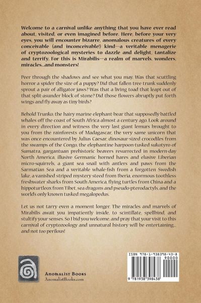 Welcome to a carnival unlike anything that you have ever read about, visited, or even imagined before. Here, before your very eyes, you will encounter bizarre, anomalous creatures of every conceivable (and inconceivable!) kind--a veritable menagerie of cryptozoological mysteries to dazzle and delight, tantalize and terrify. For this is Mirabilis--a realm of marvels, wonders, miracles...and monsters! Peer through the shadows and see what you may. Was that scuttling horror a spider the size of a puppy? Did that fallen tree trunk suddenly sprout a pair of alligator jaws? Was that a living toad that leapt out of that split-asunder block of stone? Did those flowers abruptly put forth wings and fly away as tiny birds? Behold Trunko, the hairy marine elephant-bear that supposedly battled whales off the coast of South Africa almost a century ago. Look around in every direction and witness the very last giant lemurs brought to you from the rainforests of Madagascar, the very same unicorn that was once encountered by Julius Caesar, dinosaur-sized crocodiles from the swamps of the Congo, the elephantine harpoon-tusked sukotyro of Sumatra, gargantuan prehistoric beavers resurrected in modern-day North America, illusive Germanic horned hares and elusive Liberian micro-squirrels, a giant sea snail with antlers and paws from the Sarmatian Sea and a veritable whale-fish from a forgotten Swedish lake, a vanished striped mystery steed from Iberia, enormous toothless freshwater sharks from South America, flying turtles from China and a hippoturtleox from Tibet, sea dragons and pseudo-pterodactyls, and the world's only known tusked megalopedus. Let us not tarry even a moment longer. The miracles and marvels of Mirabilis await you.