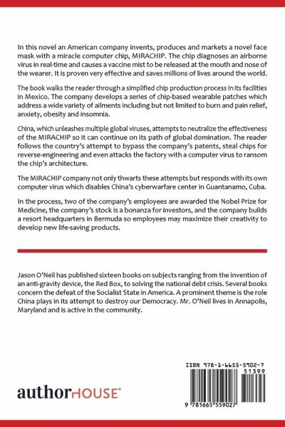 In this novel an American company invents, produces and markets a novel face mask with a miracle computer chip, MIRACHIP. The chip diagnoses an airborne virus in real-time and causes a vaccine mist to be released at the mouth and nose of the wearer. It is proven very effective and saves millions of lives around the world. The book walks the reader through a simplified chip production process in its facilities in Mexico. The company develops a series of chip-based wearable patches which address a wide variety of ailments including but not limited to burn and pain relief, anxiety, obesity and insomnia. China, which unleashes multiple global viruses, attempts to neutralize the effectiveness of the MIRACHIP so it can continue on its path of global domination. The reader follows the country's attempt to bypass the company's patents, steal chips for reverse-engineering and even attacks the factory with a computer virus to ransom the chip's architecture. The MIRACHIP company not only thwarts these attempts but responds with its own computer virus which disables China's cyberwarfare center in Guantanamo, Cuba. In the process, two of the company's employees are awarded the Nobel Prize for Medicine, the company's stock is a bonanza for investors, and the company builds a resort headquarters in Bermuda so employees may maximize their creativity to develop new life-saving products.
