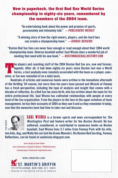 Before the Boston Red Sox became the 2013 World Champions, there was the season that broke the curse and started it all...Saul Wisnia's Miracle at Fenway tells that story. The players and coaching staff of the 2004 Boston Red Sox are now and forever, legends. After all, it had been eighty-six years since Boston last won a World Series, a fact anybody even remotely associated with the team as a player, executive, or fan was reminded of on a daily basis. For members of the 2004 Red Sox roster, winning that October was one of the greatest experiences in their lives. For fans, the '04 team will always be remembered as the one that finally silenced the "1918" chants. Hundreds of articles and numerous books were written in the immediate aftermath of the thrilling '04 season, but ten years have passed and Miracle at Fenway has a fresh perspective, including the type of analysis and insight that comes with a decade of reflection. As a Red Sox fan since birth, and from having written about and worked alongside the team for his entire professional life, Saul Wisnia has cultivated relationships with people at every level of the Sox organization. From the players to the fans to the upper echelons of team management, he has their accounts of 2004 as they saw it and as they remember it today, now that the memories have had time to take root and blossom. In the winning tradition of baseball oral histories, Wisnia tells the story of 2004 as experienced by the people who lived it, in an engaging style filled with insight and excitement.