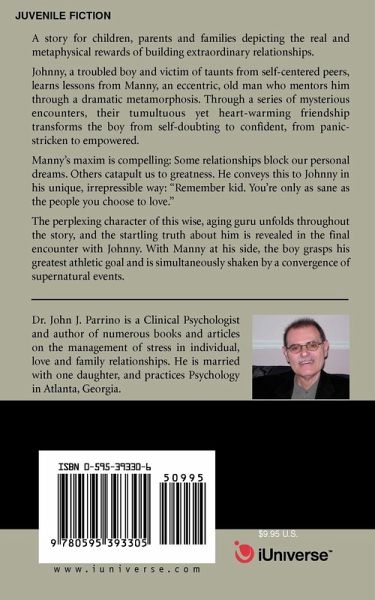 A story for children, parents and families depicting the real and metaphysical rewards of building extraordinary relationships. Johnny, a troubled boy and victim of taunts from self-centered peers, learns lessons from Manny, an eccentric, old man who mentors him through a dramatic metamorphosis. Through a series of mysterious encounters, their tumultuous yet heart-warming friendship transforms the boy from self-doubting to confident, from panic-stricken to empowered. Manny's maxim is compelling: Some relationships block our personal dreams. Others catapult us to greatness. He conveys this to Johnny in his unique, irrepressible way: "Remember kid. You're only as sane as the people you choose to love." The perplexing character of this wise, aging guru unfolds throughout the story, and the startling truth about him is revealed in the final encounter with Johnny. With Manny at his side, the boy grasps his greatest athletic goal and is simultaneously shaken by a convergence of supernatural events.