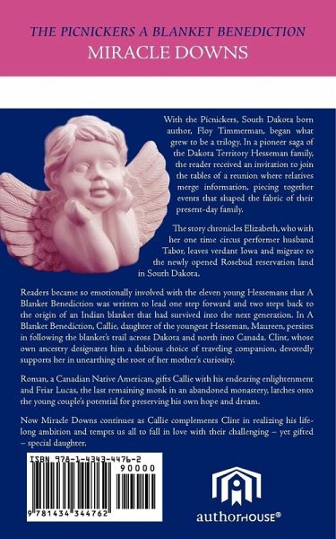 THE PICNICKERS A BLANKET BENEDICTION MIRACLE DOWNS With the Picnickers, South Dakota born author, Floy Timmerman, began what grew to be a trilogy. In a pioneer saga of the Dakota Territory Hesseman family, the reader received an invitation to join the tables of a reunion where relatives merge information, piecing together events that shaped the fabric of their present-day family. The story chronicles Elizabeth, who with her one time circus performer husband Tabor, leaves verdant Iowa and migrate to the newly opened Rosebud reservation land in South Dakota. Readers became so emotionally involved with the eleven young Hessemans that A Blanket Benediction was written to lead one step forward and two steps back to the origin of an Indian blanket that had survived into the next generation. In A Blanket Benediction, Callie, daughter of the youngest Hesseman, Maureen, persists in following the blanket's trail across Dakota and north into Canada. Clint, whose own ancestry designates him a dubious choice of traveling companion, devotedly supports her in unearthing the root of her mother's curiosity. Roman, a Canadian Native American, gifts Callie with his endearing enlightenment and Friar Lucas, the last remaining monk in an abandoned monastery, latches onto the young couple's potential for preserving his own hope and dream.Now Miracle Downs continues as Callie complements Clint in realizing his life-long ambition and tempts us all to fall in love with their challenging - yet gifted - special daughter.