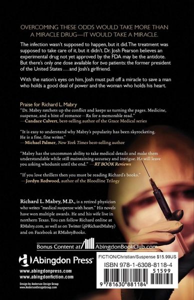 The infection wasn't supposed to happen, but it did. The treatment was supposed to take care of it, but it didn't. Then Dr. Josh Pearson discovers why--his patients, including the former President of the United States, have been dosed with a different strain of the original virus, one that is universally fatal. The only chance for survival is treatment with an experimental drug, but the manufacturer might already have discarded its supply. As if treating the President of the United States isn't stressful enough, the situation goes from bad to worse when Rachel Moore, a nurse Josh is falling in love with, falls ill. With the nation's eyes on him, Josh must pull off a miracle to save a man who holds a good deal of power and the woman who holds his heart.