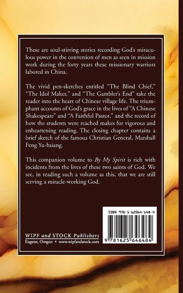 These are soul-stirring stories recording God's miraculous power in the conversion of men as seen in mission work during the forty years these missionary warriors labored in China. The vivid pen-sketches titled ""The Blind Chief,"" ""The Idol Maker,"" and ""The Gambler's End"" take the reader into the heart of Chinese village life. The triumphant accounts of God's grace in the lives of ""A Chinese Shakespeare"" and ""A Faithful Pastor,"" and the record of how the students were reached makes for vigorous and enheartening reading. The closing chapter contains a brief sketch of the famous Christian General, Marshall Feng Yu-hsiang. This companion volume to By My Spirit is rich with incidents from the lives of these two saints of God. We see, in reading such a volume as this, that we are still serving a miracle-working God.