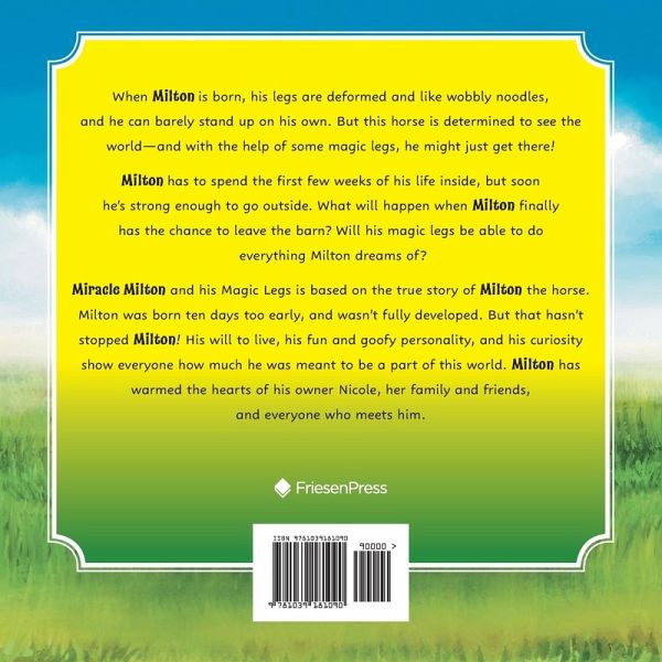 When Milton is born, his legs are deformed and like wobbly noodles, and he can barely stand up on his own. But this horse is determined to see the world-and with the help of some magic legs, he might just get there! Milton has to spend the first few weeks of his life inside, but soon he's strong enough to go outside. What will happen when Milton finally has the chance to leave the barn? Will his magic legs be able to do everything Milton dreams of? Miracle Milton and his Magic Legs is based on the true story of Milton the horse. Milton was born ten days too early, and wasn't fully developed. But that hasn't stopped Milton! His will to live, his fun and goofy personality, and his curiosity show everyone how much he was meant to be a part of this world. Milton has warmed the hearts of his owner Nicole, her family and friends, and everyone who meets him.