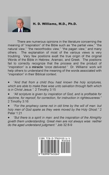 There are numerous opinions in the literature concerning the meaning of "inspiration" of the Bible such as "the partial view," "the natural view," "the neoorthodox view," "the pagan view," and many others. The explanation of most of the various views is very troubling. Very few positions exalt the true origin of the original Words of the Bible in Hebrew, Aramaic, and Greek. The positions fail to correctly recognize that the process and the product of "inspiration" is a miracle "once delivered." Dr. Williams' work will help others to understand the meaning of the words associated with "inspiration" in their Biblical context.
