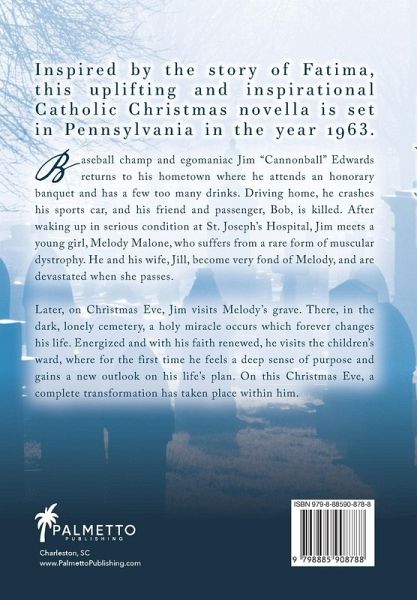 Inspired by the story of Fatima, this uplifting and inspirational Catholic Christmas novella is set in Pennsylvania in the year 1963. Baseball champ and egomaniac Jim "Cannonball" Edwards returns to his hometown where he attends an honorary banquet and has a few too many drinks. Driving home, he crashes his sports car, and his friend and passenger, Bob, is killed. After waking up in serious condition at St. Joseph's Hospital, Jim meets a young girl, Melody Malone, who suffers from a rare form of muscular dystrophy. He and his wife, Jill, become very fond of Melody, and are devastated when she passes. Later, on Christmas Eve, Jim visits Melody's grave. There, in the dark, lonely cemetery, a holy miracle occurs which forever changes his life. Energized and with his faith renewed, he visits the children's ward, where for the first time he feels a deep sense of purpose and gains a new outlook on his life's plan. On this Christmas Eve, a complete transformation has taken place within him.