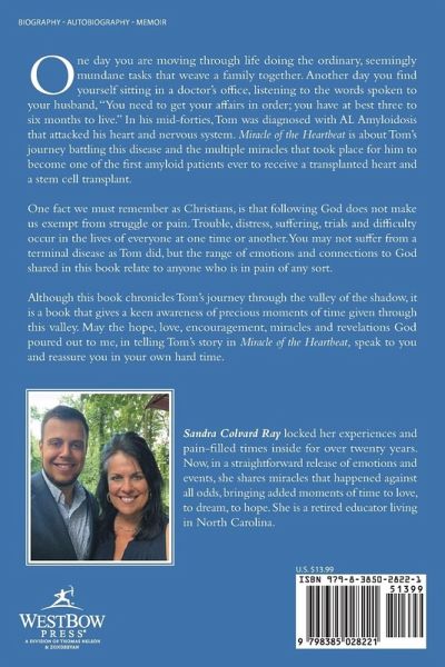 One day you are moving through life doing the ordinary, seemingly mundane tasks that weave a family together. Another day you find yourself sitting in a doctor's office, listening to the words spoken to your husband, "You need to get your affairs in order; you have at best three to six months to live." In his mid-forties, Tom was diagnosed with AL Amyloidosis that attacked his heart and nervous system. Miracle of the Heartbeat is about Tom's journey battling this disease and the multiple miracles that took place for him to become one of the first amyloid patients ever to receive a transplanted heart and a stem cell transplant. One fact we must remember as Christians, is that following God does not make us exempt from struggle or pain. Trouble, distress, suffering, trials and difficulty occur in the lives of everyone at one time or another. You may not suffer from a terminal disease as Tom did, but the range of emotions and connections to God shared in this book relate to anyone who is in pain of any sort. Although this book chronicles Tom's journey through the valley of the shadow, it is a book that gives a keen awareness of precious moments of time given through this valley. May the hope, love, encouragement, miracles and revelations God poured out to me, in telling Tom's story in Miracle of the Heartbeat, speak to you and reassure you in your own hard time.