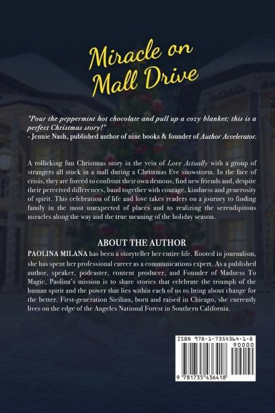 Miracle on Mall Drive is a rollicking fun Christmas story in the vein of "Love Actually" that will warm your heart and have you feeling the magic of the holiday season. When a group of strangers all get stuck in a mall during an unexpected Christmas Eve snowstorm, they're forced to face their old demons, find new friends and band together, despite their perceived differences, with kindness and generosity in the face of crisis. This celebration of life and love takes readers on a journey to finding family and friends in the most unexpected of places and to realizing the serendipitous miracles along the way and the true meaning of the holiday season. Miracle on Mall Drive is the perfect gift to give to yourself and to loved ones. It's a much-needed reminder of the spirit of the season and the true miracle and meaning of Christmas. Celebrate the holiday season of love, peace, and goodwill to all by treating yourself to this Miracle on Mall Drive Christmas story.