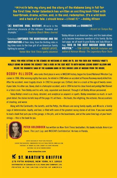For the first time, Miracle presents the full story of NASCAR legend Bobby Allison and the Alabama Gang--written with the corporation of the Allisons. While you were sitting in the stands or watching at home on TV, did you ever ask yourself what's really going on behind the scenes? Take a ride on the seat next to auto-racing legend Bobby Allison and relive the dramatic saga of the Alabama Gang in this unique look at NASCAR from the inside. Bobby Allison, who ranks fourth in wins in NASCAR history, began his Grand National/Winston Cup career in 1966. After winning eighty-five races, he retired in 1988 when an accident at Pocono Raceway nearly killed him. He was severely brain injured, and it took him a full fifteen years to recover. After the accident, more tragedy struck. In 1992 his younger son, Clifford, died in a crash at the age of twenty-seven. A year later, his other son, Davey, died in a helicopter accident, and in 1994 he lost his close friend and protégé Neil Bonnet in a fatal crash. Then Bobby and his wife, Judy, separated and divorced. Through it all Bobby Allison persevered. Today Bobby's mind is as sharp, detailed, and analytical as anyone's in sports. Bobby remembers so much, in such great detail, the stories he tells leap off the page. It's all there--the feuds, the infighting, the victories, the accusations of cheating, and worse. Incredibly, Bobby, the poster boy for hard work, honesty, and integrity, holds nothing back, even when it reflects poorly on him. "It happened, and there's nothing I can do about that," is what he says. The result is raw racing history. Along with the Earnhardts, the Jarretts, and the Pettys, the Allisons are racing family royalty, and Miracle, a family saga of determination, loyalty, and love, is filled with some of the greatest racing stories of all time. If you ever wanted to read a book that puts you in the garage, in the pits, and in the boardrooms, and at the same time tugs at your heartstrings--this is the book for you.
