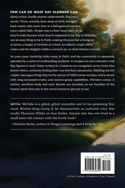 Few can do what Ray Glennon can. Many notice hardly anyone understands. Ray has a secret. Three actually. Sent away at birth brought back nearly nine years later to a beleaguered country town called Faith. People stay in their lanes here do as they're told become what they're expected to be. Ray is different not an easy thing to be in Faith making the poor kid a foreigner at home a target of torment at school. An elderly couple offers solace and the delights within a ceramic jar on their kitchen counter. As years pass hardship visits many in Faith and the community is repeatedly upended by a series of confounding incidents. It escapes no one's attention that Ray figures in each. Notes written in a hand no one recognizes arrive from who knows where curiously finding their way into Ray's possession. Riddling out the cryptic messages brings Ray to the rescue of Faith's most stricken and to terms with long-concealed truths and hard-to-grasp capabilities. Wonders ensue. A mother sacrifices body and soul. Secrets are revealed as are faculties of the human spirit that only in the rarest instances get put to use.
