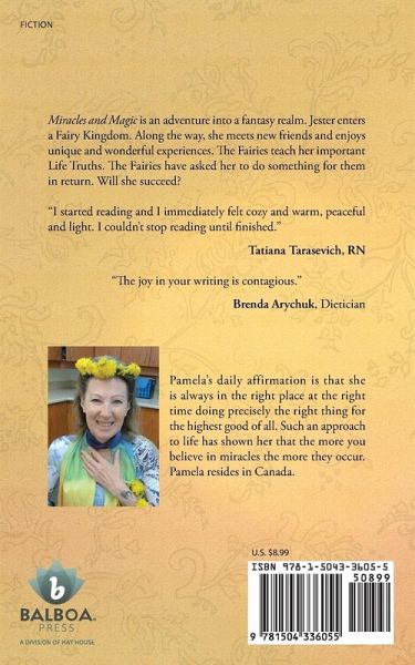 Miracles and Magic is an adventure into a fantasy realm. Jester enters a Fairy Kingdom. Along the way, she meets new friends and enjoys unique and wonderful experiences. The Fairies teach her important Life Truths. The Fairies have asked her to do something for them in return. Will she succeed? "I started reading and I immediately felt cozy and warm, peaceful and light. I couldn't stop reading until finished." Tatiana Tarasevich, RN "The joy in your writing is contagious." Brenda Arychuk, Dietician
