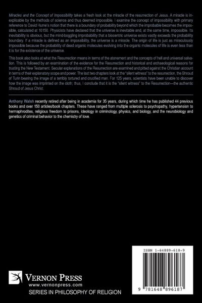 'Miracles and the Concept of Impossibility' takes a fresh look at the miracle of the resurrection of Jesus. A miracle is inexplicable by the methods of science and thus deemed impossible. I examine the concept of impossibility with primary reference to David Hume's notion that there is a boundary of probability beyond which the improbable becomes the impossible, calculated at 10150. Physicists have declared that the universe is inevitable and, at the same time, impossible. Its inevitability is obvious, but the mind-boggling improbability that a biocentric universe exists vastly exceeds the probability boundary. If a miracle is defined as an impossibility, the universe is a miracle. The origin of life is just as miraculously impossible because the probability of dead organic molecules evolving into the organic molecules of life is even less than it is for the existence of the universe. This book also looks at what the Resurrection means in terms of the atonement and the concepts of hell and universal salvation. This is followed by an examination of the evidence for the Resurrection and historical and archaeological reasons for trusting the New Testament. Secular explanations of the Resurrection are examined and pitted against the Christian account in terms of their explanatory scope and power. The last two chapters look at the "silent witness" to the resurrection, the Shroud of Turin bearing the image of a terribly tortured and crucified man. For 125 years, scientists have been unable to discover how the image was imprinted on the cloth; thus, I conclude that it is the "silent witness" to the Resurrection-the authentic Shroud of Jesus Christ.