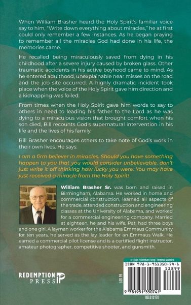 When William Brasher heard the Holy Spirit's familiar voice say to him, "Write down everything about miracles," he at first could only remember a few instances. As he began praying to remember all the miracles God had done in his life, the memories came. He recalled being miraculously saved from dying in his childhood after a severe injury caused by broken glass. Other traumatic accidents in his active boyhood came to mind. As he entered adulthood, unexplainable near misses on the road and the job site occurred. A highly dramatic incident took place when the voice of the Holy Spirit gave him direction and a kidnapping was foiled. From times when the Holy Spirit gave him words to say to others in need to leading his father to the Lord as he was dying to a miraculous vision that brought comfort when his son died, Bill recounts God's supernatural intervention in his life and the lives of his family. Bill Brasher encourages others to take note of God's work in their own lives. He says: I am a firm believer in miracles. Should you have something happen to you that you would consider unbelievable, don't just write it off thinking how lucky you were. You may have just received a miracle from the Holy Spirit!