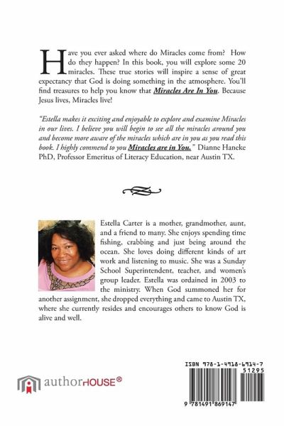 Have you ever asked where do Miracles come from? How do they happen? In this book, you will explore some 20 miracles. These true stories will inspire a sense of great expectancy that God is doing something in the atmosphere. You'll find treasures to help you know that Miracles Are In You. Because Jesus lives, Miracles live! "Estella makes it exciting and enjoyable to explore and examine Miracles in our lives. I believe you will begin to see all the miracles around you and become more aware of the miracles which are in you as you read this book. I highly commend to you Miracles are in You." Dianne Haneke PhD, Professor Emeritus of Literacy Education, near Austin TX. Estella Carter is a mother, grandmother, aunt, and a friend to many. She enjoys spending time fishing, crabbing and just being around the ocean. She loves doing different kinds of art work and listening to music. She was a Sunday School Superintendent, teacher, and women's group leader. Estella was ordained in 2003 to the ministry. When God summoned her for another assignment, she dropped every- thing and came to Austin TX, where she currently resides and encourages others to know God is alive and well.