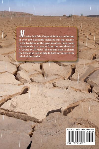 Miracles Fall Like Drops of Rain is a collection of over 250 classically styled poems that rhyme, including villanelles, rondeaus, sonnets and more, in the classical tradition of the great masters. Each poem corresponds to a lesson from A Course in Miracles Workbook for Students. The poems help to clarify the lessons as well as help to hold key ideas in the mind of the reader. These inspirational poems will appeal not only to students of ACIM, but also to practitioners of any non-dualistic thought system or students ready for concepts of advanced forgiveness.