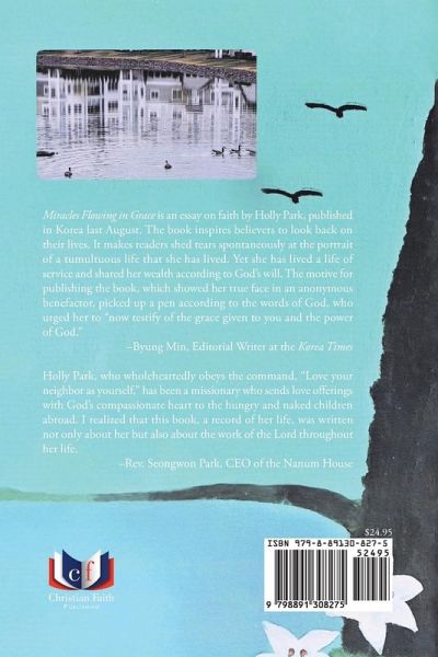 Miracles Flowing in Grace is an essay on faith by Holly Park, published in Korea last August. The book inspires believers to look back on their lives. It makes readers shed tears spontaneously at the portrait of a tumultuous life that she has lived. Yet she has lived a life of service and shared her wealth according to God's will. The motive for publishing the book, which showed her true face in an anonymous benefactor, picked up a pen according to the words of God, who urged her to "now testify of the grace given to you and the power of God." --Byung Min, Editorial Writer at the Korea Times Holly Park, who wholeheartedly obeys the command, "Love your neighbor as yourself," has been a missionary who sends love offerings with God's compassionate heart to the hungry and naked children abroad. I realized that this book, a record of her life, was written not only about her but also about the work of the Lord throughout her life. --Rev. Seongwon Park, CEO of the Nanum House