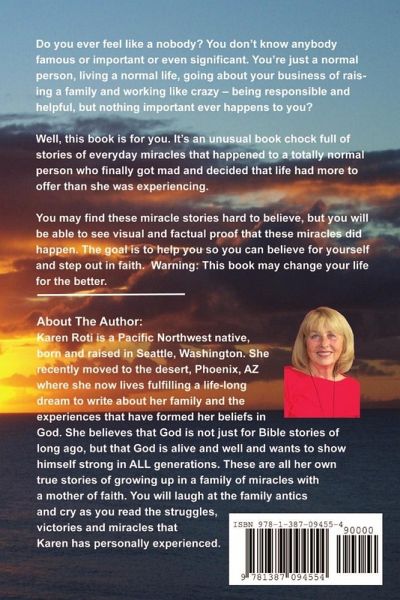Do you need a miracle? This book is full of stories of everyday miracles that happened to normal, everyday people. God is not just for Bible stories. He is alive and is the same today as He was 2000 years ago. Our goal is to help you so you can believe for yourself and step out in faith.