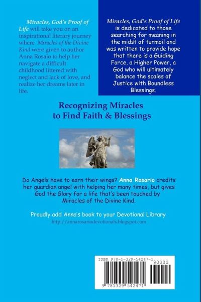 Anna Rosario should not be here. Three times she died and left her body, only to return to the battle-broken and scarred but not defeated. At times it took heavy-duty miracles to keep her alive-Miracles of the Divine Kind. On other occasions, the miracles of modern medicine, combined with God's grace, handled the crisis. But Anna's story is also about the power of prayer that can lead to the little miracles, the Godwinks that can uplift our lives each and every day if only we learn to recognize them as Gifts from God. Despite the setbacks of a broken home, Anna was able to not only survive, but thrive finding both faith and blessing in spite of ongoing personal struggles. On the pages of Miracles, God's Proof of Life, you'll be able to walk a ways in Anna's shoes and imagine not only surviving what she went through, but finding incredible strength, drive, faith, humanity, and resolve all made possible by a spirit supported by God's Love. http://annarosariodevotionals.blogspot.com