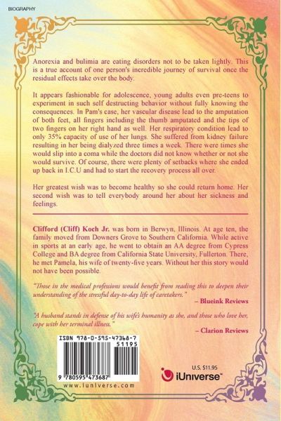 Anorexia and bulimia are eating disorders not to be taken lightly. This is a true account of one person's incredible journey of survival once the residual effects take over the body. It appears fashionable for adolescence, young adults even pre-teens to experiment in such self destructing behavior without fully knowing the consequences. In Pam's case, her vascular disease lead to the amputation of both feet, all fingers including the thumb amputated and the tips of two fingers on her right had as well. Her respiratory condition lead to only 35% capacity of use of her lungs. She suffered from kidney failure resulting in her being dialyzed three times a week. There were times she would slip into a coma while the doctors did not know whether or not she would survive. Of course, there were plenty of set backs where she ended up back in I.C.U and had to start the recovery process all over. Her greatest wish was to become healthy so she could return home. Her second wish was to tell everybody around her about her sickness and feelings.