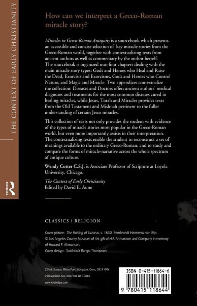 Miracles in Greco-Roman Antiquity presents a collection in translation of miracle stories from the ancient world. The material is divided up into four main categories including healing, exorcism, nature and raising the dead. Wendy Cotter, in an introduction and notes to the selections, contextualizes the miracles within the background of the Greco-Roman world and also compares the stories to other Jewish and non-Jewish miracle stories of the Mediterranean world. This sourcebook provides an interdisciplinary collection of material which will be of value to students of the New Testament.