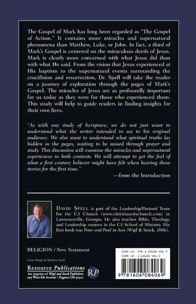 Description: The Gospel of Mark has long been regarded as ""The Gospel of Action."" It contains more miracles and supernatural phenomena than Matthew, Luke, or John. In fact, a third of Mark's Gospel is centered on the miraculous deeds of Jesus. Mark is clearly more concerned with what Jesus did than with what He said. From the vision that Jesus experienced at His baptism to the supernatural events surrounding the crucifixion and resurrection, Dr. Spell will take the reader on a journey of exploration through the pages of Mark's Gospel. The miracles of Jesus are as profoundly important for us today as they were for those who experienced them. This study will help to guide readers in finding insights for their own lives. Endorsements: ""As with any study of Scripture, we do not just want to understand what the writer intended to say to his original audience. We also want to understand what spiritual truths lay hidden in the pages, waiting to be mined through prayer and study. This discussion will examine the miracles and supernatural experiences in both contexts. We will attempt to get the feel of what a first century believer might have felt when hearing these stories for the first time."" --from the Introduction About the Contributor(s): David Spell is part of the Leadership/Pastoral Team for the C3 Church (www.christiancitychurch.com) in Lawrenceville, Georgia. He also teaches Bible, Theology, and Leadership courses in the C3 School of Ministry. His first book was Peter and Paul in Acts (Wipf & Stock, 2006).