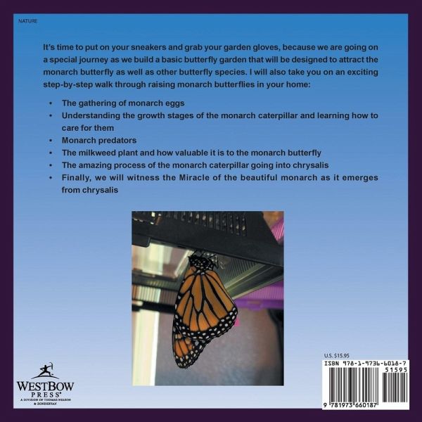 It's time to put on your sneakers and grab your garden gloves, because we are going on a special journey as we build a basic butterfly garden designed to attract the monarch butterfly as well as other butterfly species. I will also take you on an exciting step-by-step walk through raising monarch butterflies in your home: ¿ The gathering of monarch eggs ¿ Understanding the growth stages of the monarch caterpillar and learning how to care for them ¿ Predators of monarch butterflies ¿ The milkweed plant and how valuable it is to the monarch butterfly ¿ The amazing process of the monarch caterpillar going into chrysalis ¿ Witnessing the miracle of the beautiful monarch as it emerges from chrysalis