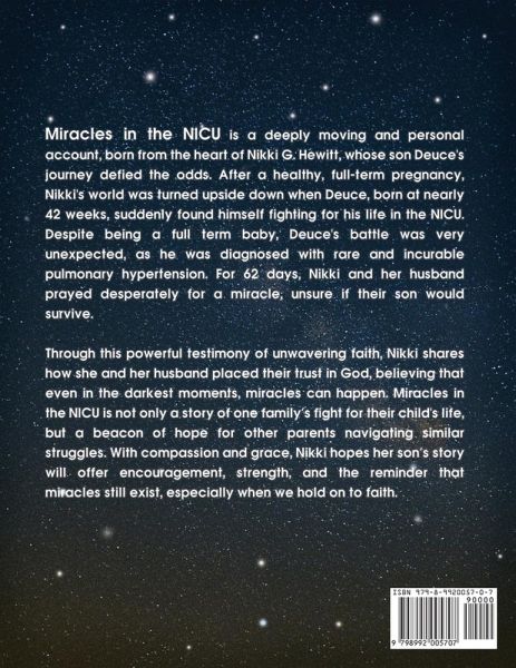 Miracles in the NICU is a deeply moving and personal account, born from the heart of Nikki G. Hewitt, whose son Deuce's journey defied the odds. After a healthy, full-term pregnancy, Nikki's world was turned upside down when Deuce, born at nearly 42 weeks, suddenly found himself fighting for his life in the NICU. Despite being a full term baby, Deuce's battle was very unexpected, as he was diagnosed with rare and incurable pulmonary hypertension. For 62 days, Nikki and her husband prayed desperately for a miracle, unsure if their son would survive. Through this powerful testimony of unwavering faith, Nikki shares how she and her husband placed their trust in God, believing that even in the darkest moments, miracles can happen. Miracles in the NICU is not only a story of one family's fight for their child's life, but a beacon of hope for other parents navigating similar struggles. With compassion and grace, Nikki hopes her son's story will offer encouragement, strength, and the reminder that miracles still exist, especially when we hold on to faith.